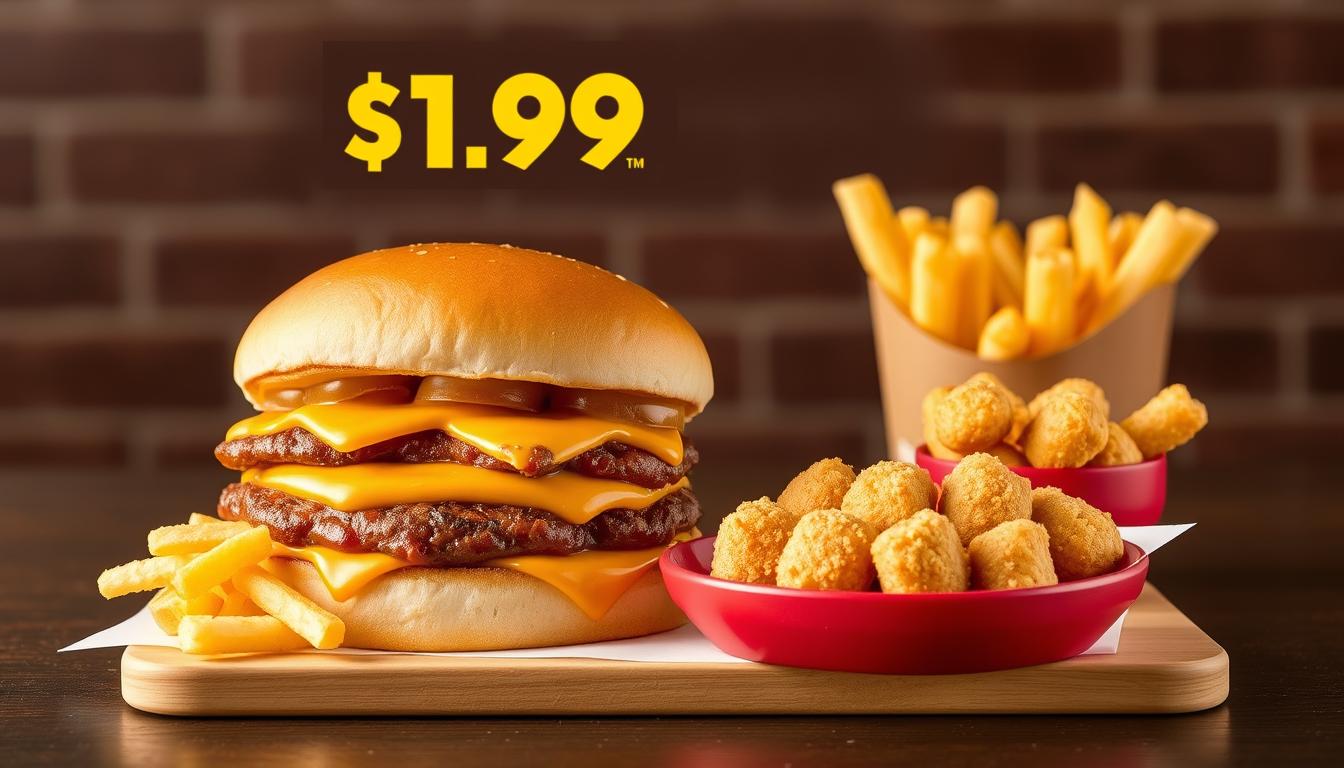 The $1.99 Menu has 14 items, like the Classic Cheeseburger and Small Jumbo Popcorn Chicken. With prices so low, customers can try many things without spending a lot. These items have calories ranging from 150 to 740, so there’s something for every diet.